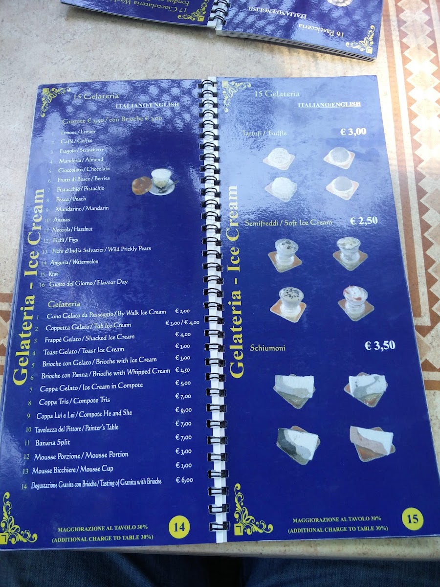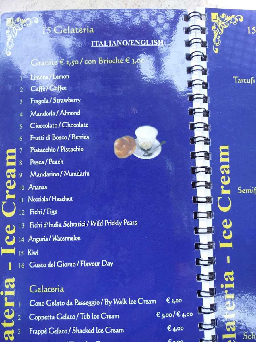 The offerings balance familiar comfort with a local touch—think granita varieties including pistachio, coffee with cream, or strawberry with panna, alongside non-alcoholic tropical fruit cocktails and Sicilian breakfast staples. Light pizza options and small appetizers fit well for casual gatherings or a relaxed pause from exploration.